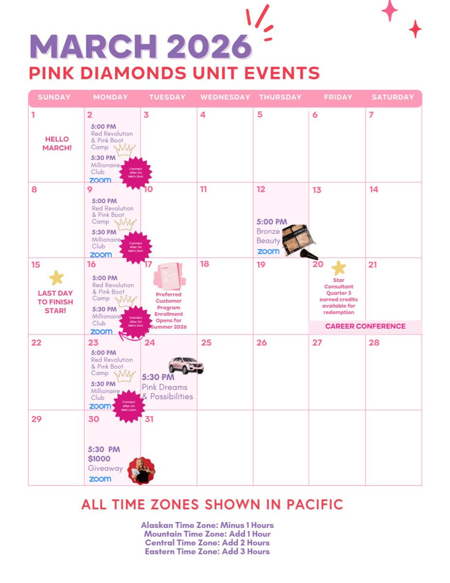 Every Monday at 5:30 PSTThis Millionaire Club is for all beauty consultants to have an opportunity to get recognition, girlfriend time, and learn the basics of your business on a weekly Monday team training zoom session. Those who show up go up! View below to get a sneak peek of this months exciting trainings!